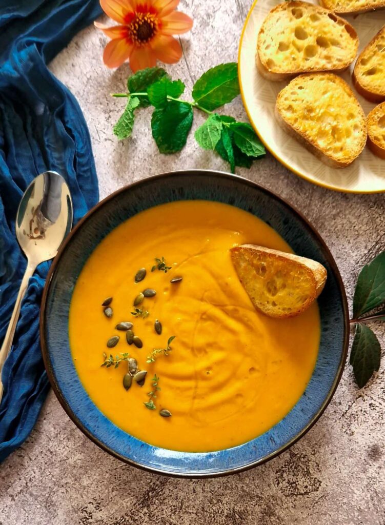 O rețetă clasică de toamnă – catifelată, dulceagă și reconfortantă. Se face rapid, mai ales dacă ai dovleacul copt dinainte, și merge de minune cu crutoane aurii sau semințe de dovleac prăjite.