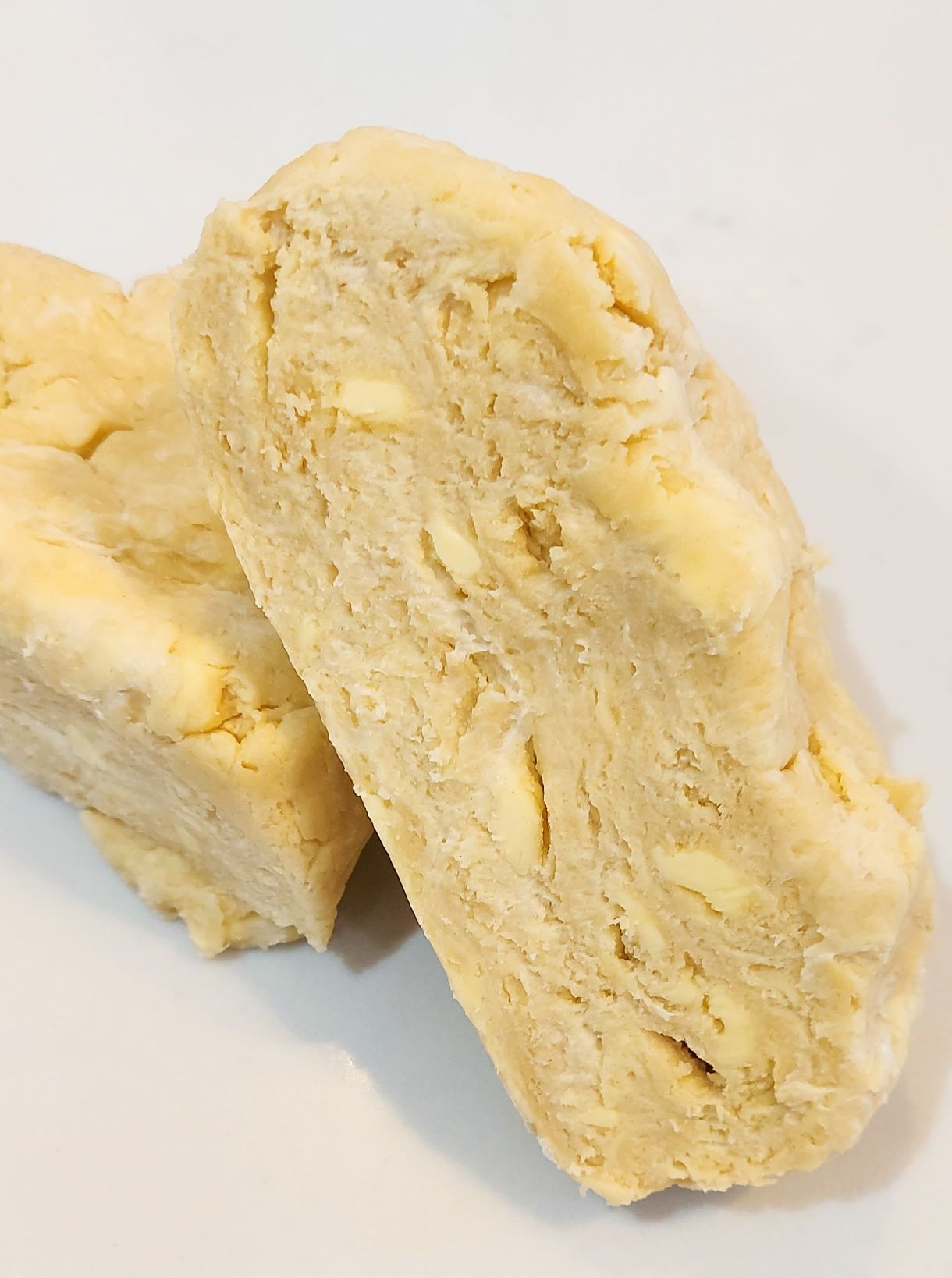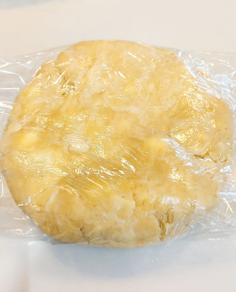 Impartitil in doua, aplotizati fiecare bucata in discuri de circa 2 cm grosime, inveliti in folie de plastic si fuguta la frigider cu el pentru cateva ore. Cu cat mai multe cu atat mai bine. Puteti face aluatul spre exemplu seara, pana maine este numai bun de copt.