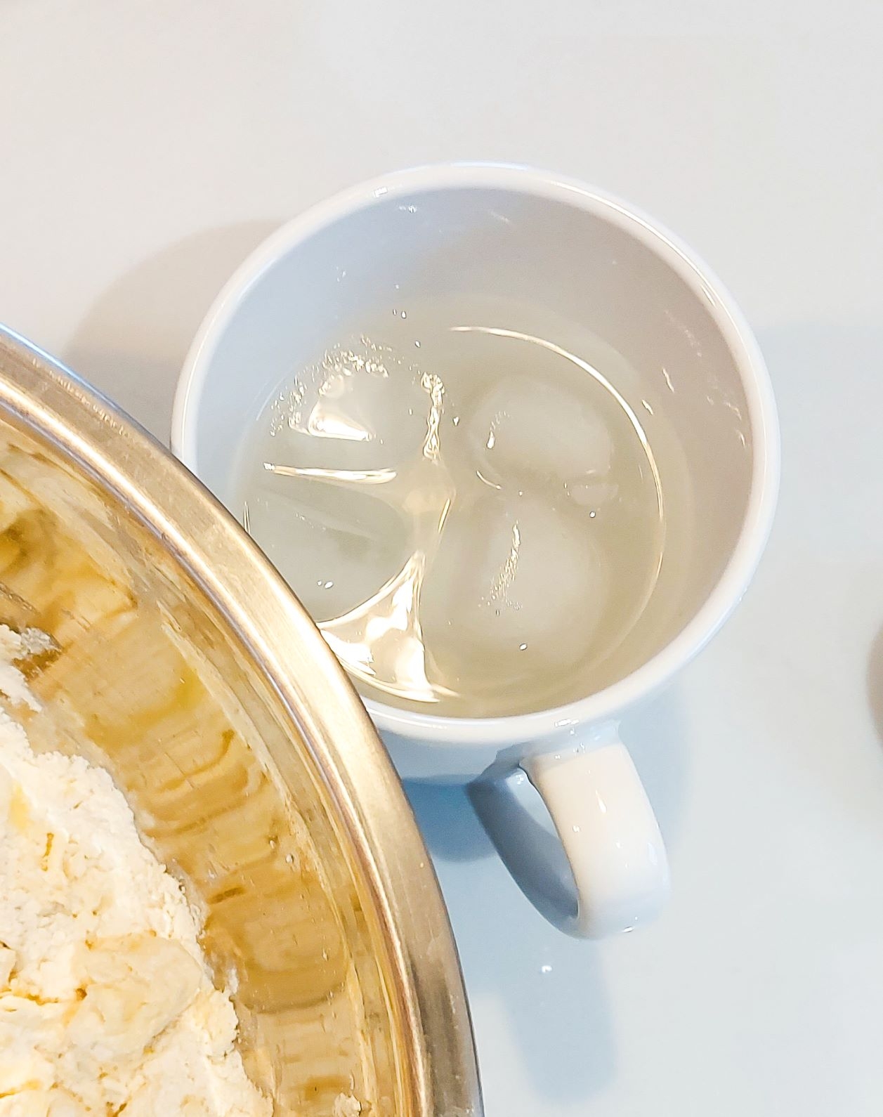 - Apa rece cu gheata. Din acelas motiv mentionat mai sus cand va spuneam sa pastrati untul si margarina la rece. Apa rece cu gheata previne topirea grasimilor. Masurati 100 ml de apa rece in care adaugati apoi 3-4 cuburi de gheata, pastrati-o langa voi si adaugati cate o lingura pe rand. Eu am folosit 100 ml de apa rece, sau 7 linguri ( 15 ml o lingura = 105 ml, nu cred ca 5ml fac o mare diferenta, sincer ) Masurati cu lingura si adaugati apa treptat. Dece ? Daca nu folositi acelas tip de faina ca mine este foarte posibil sa aveti nevoie de mai multa sau mai putina.