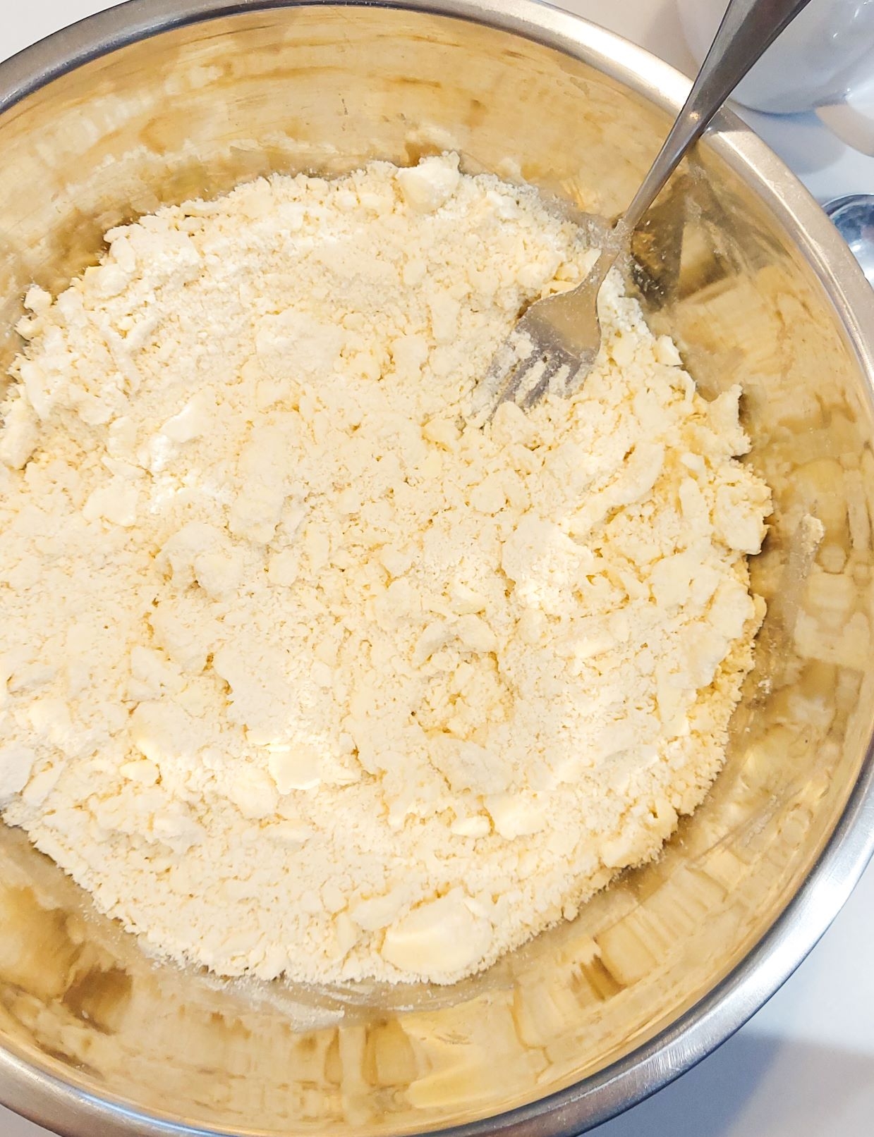 - Prima data puneti untul si margarina taiate cubulete. Adaugati peste ele faina si sarea si cu ajutorul a doua furculite amestecati, presand usor cu furculita untul in faina. Faceti asta pana obtinetiun amestec sfaramicios.