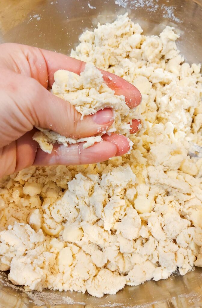Adaugati apa si amestecati pana observati ca aluatul incepe sa se adune in bucati mari, incercati apoi cu degetele, strangeti putin aluat intre degete, daca acesta se uneste usor si isi pastreaza forma, ati pusa apa suficienta.