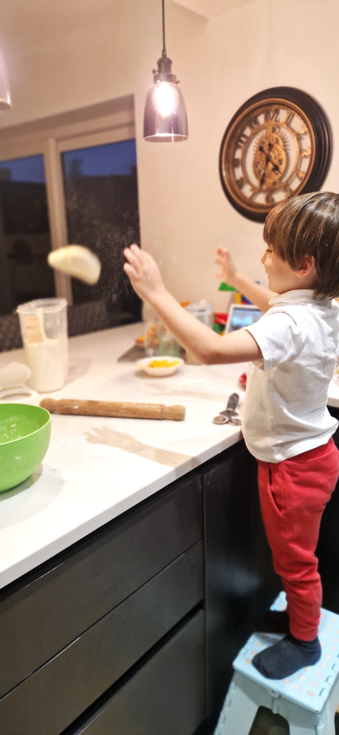 - Lucram aluatul cu mainile si adaugam faina pana obtinem un aluat moale, elastic si nelipicios.