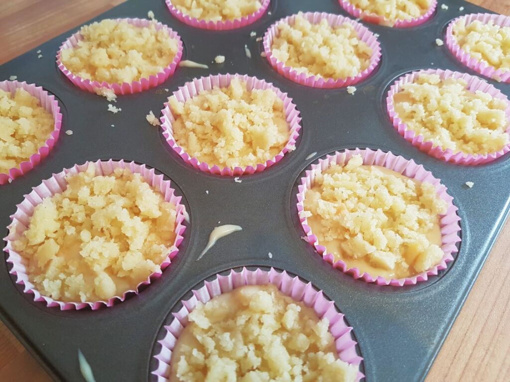 - Cu ajutorul degetelor, rupeți bucăți mici din crumble și presărați-le uniform deasupra fiecărei brioșe.