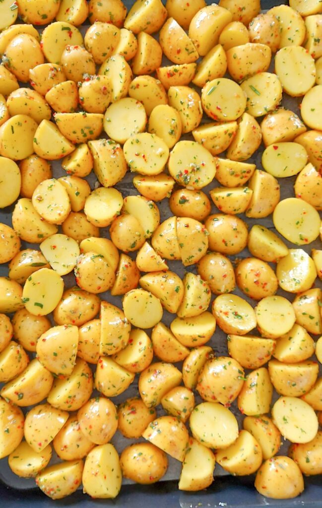- Cartofi se taie pe jumatate, peste acestia se adauga condimentele si se amesteca bine pana ce toti cartofi sunt acoperiti in ulei si condimente.