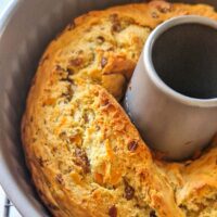 Adaugare stafidelor maruntite in acest chec cu banane nu doar inbogateste gustul si textura, dar si aduc un alt niver de indulcire naturala. Alaturi de banane ele fac acest chec dulce, sanatos si bine echilibrat.