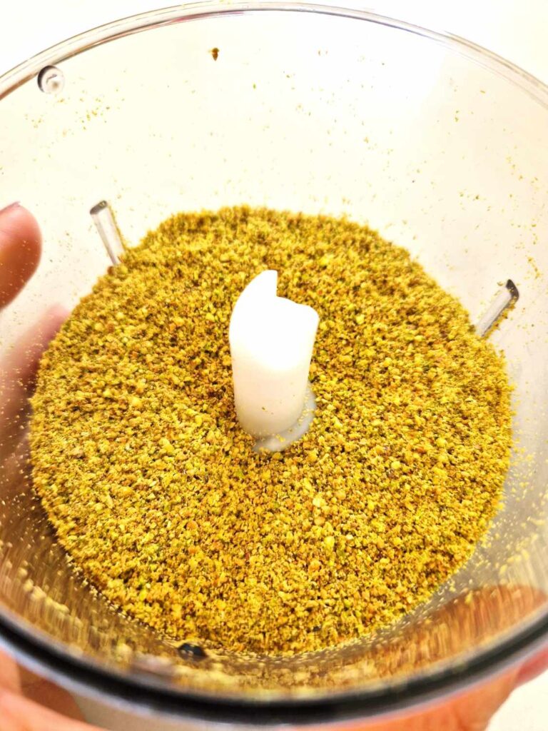 Truc: Poți păstra 1-2 linguri de fistic măcinat mai gros pentru a presăra deasupra înainte de coacere sau peste glazură.