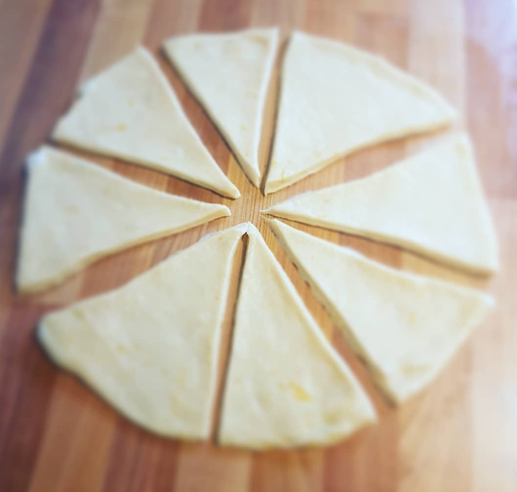 - Intr-un vas incapator se pune 500 gr faina, am explicat Aici dece nu toata deodata. Se adauga ouale si prafu de sare, apoi amestecul de lapte, zahar si ulei. Se framanta pana se obtine un aluat moale, nelipicos. Se pune deoparte la crescut pana isi dubleaza volumul. Circa o ora si jumatate. Cand aluatul a crescut, se framanta putin si se imparte in doua parti egale. Prima bucata se face precum o bila rotunda, apoi se intinde, si se taie in 8 triunghiuri egale. Precum in imaginile de mai sus.