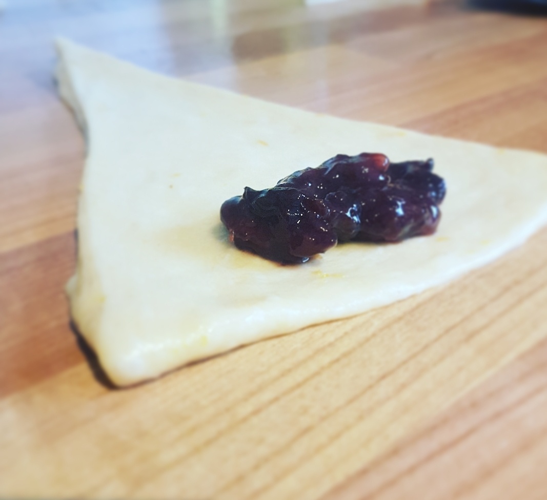 - Se amesteca dulceata int-un bol impreuna cu nucile tocate, apoi pe ficare triungi obtinut se adauga o lingurita de dulceata si se ruleaza in forma de corn. Se pun intr- tava incapatoare pregatita in prealabil cu hartie de copt. Se lasa din nou la crescut pentru circa 25 de minute.
