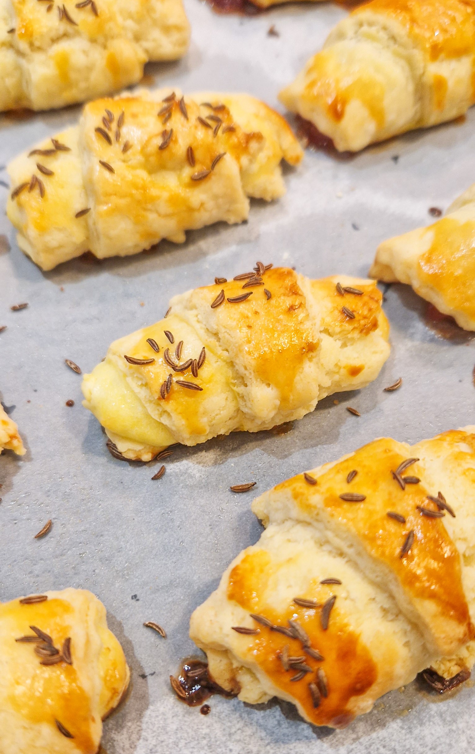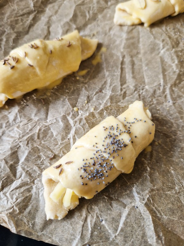 - Umplem cornulețele cu umplutura preferată, le așezăm în tava de copt tapetată cu hârtie, le ungem cu ou și presărăm deasupra chimen, mac sau susan.