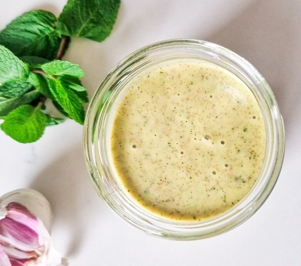Gustul acesui dressing este minunat, o combinatie excelenta intre menta, usturoi proaspat, miere pentru un gust usor dulce, suc de lamaie si otet de mere.