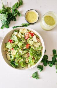 Acest Dressing cu menta are un gust proaspat, echilibrat si poate fi folosit la diferite salate cu quinoa, bulgur, paste sau cuscus.