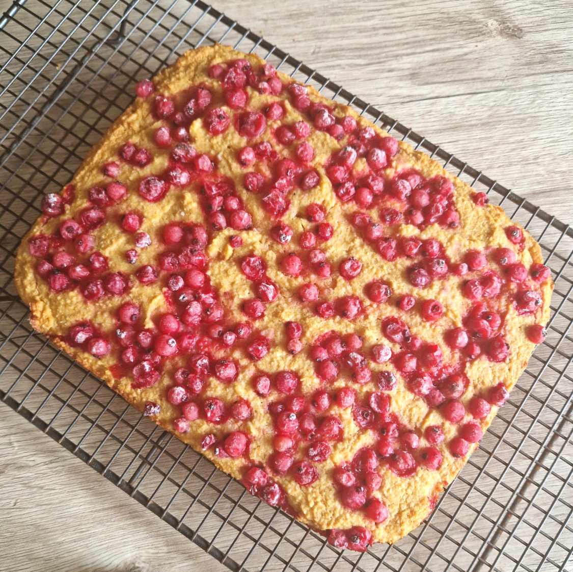 Pe deasupra am adăugat fructe proaspete, dar aici am învățat o lecție: unele au fost cam acre și au schimbat gustul prăjiturii. Data viitoare le-aș înlocui cu ceva mai dulce (poate niște banană coaptă sau câteva curmale tăiate mărunt), sau le-aș pune doar în interior, nu deasupra.