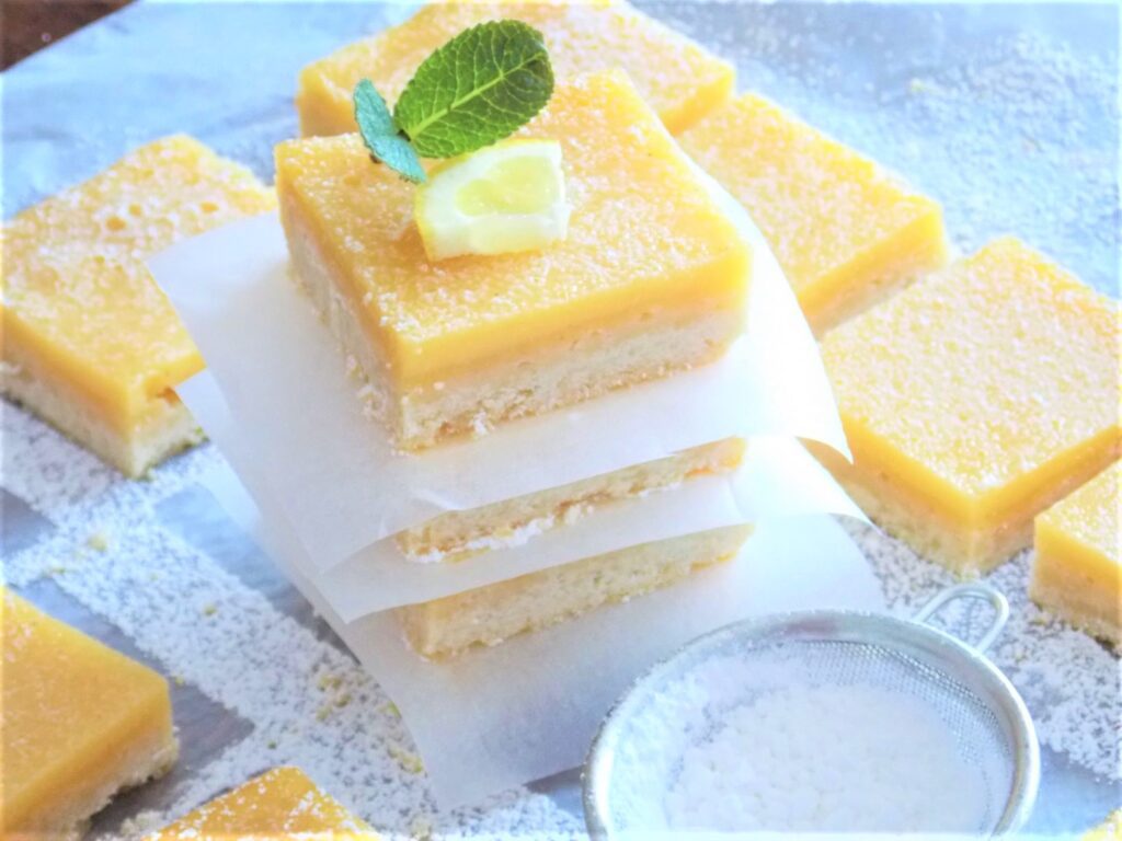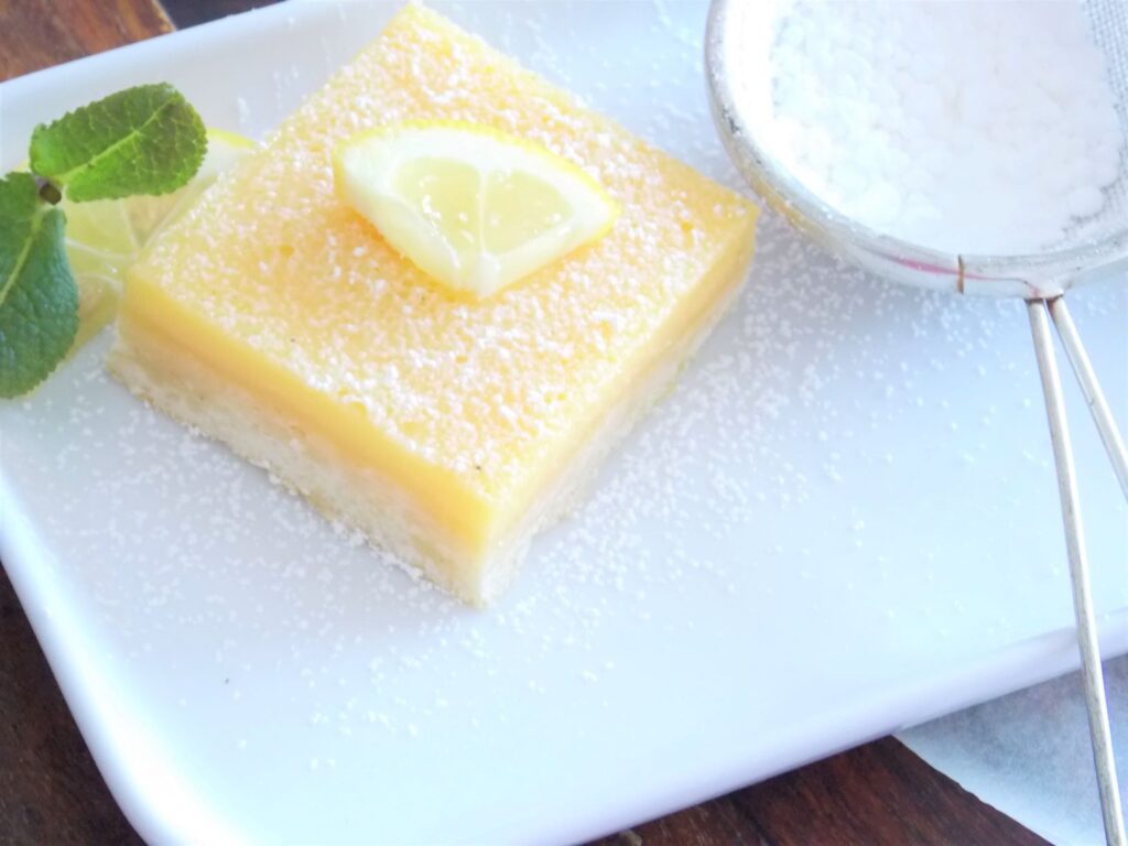 - Zaharul se amesteca cu faina, se adauga apoi ouale pe rand si la final sucul de lamaie. Aceasta crema merge peste blatul de mai sus, scos din cuptor si lasat putin la racit inainte. Se baga din nou la cuptor pentru 22 - 26 de minute, sau pana ce crema sa intarit. Se raceste complet la temperature camerei apoi merge la frigider pentru 1-2 ore.Obtional, se pudreaza cu zahar innainte de servire.