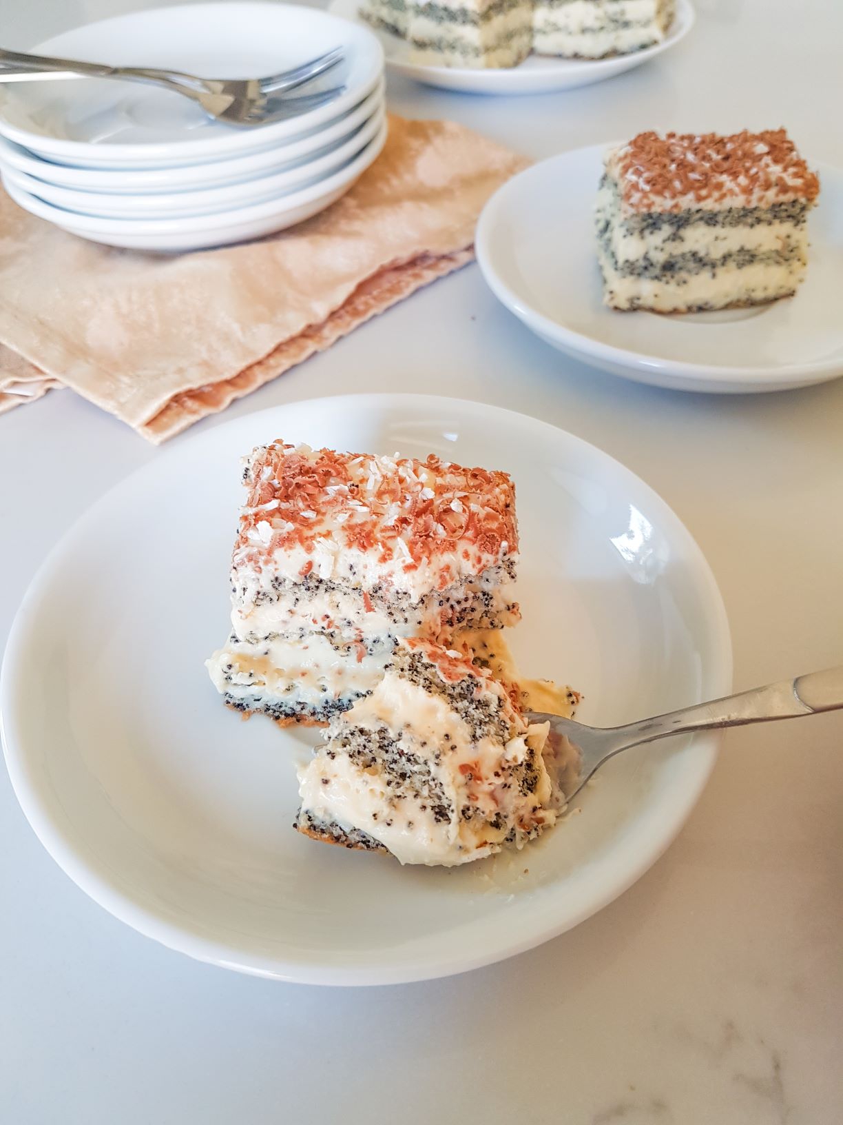 Combinatia blat pufos cu mac si crema fina si catifelata de vanilie este una absolut delicioasa care nu te lasa sa te opresti doar la o felie.
