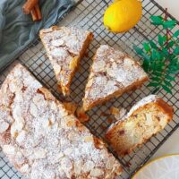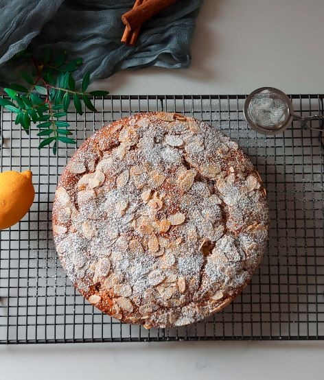 - Aluatul se pune in tava tapetata cu hartie de copt, deasupra decoram cu migdale si apoi bagam la cuptorul preincalzit la 180° C pt circa 45 de minute sau trece testul cu scobitoarea.