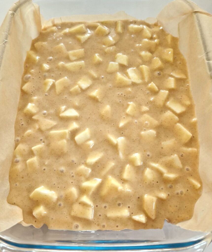 - Peste aluatul obținut, adăugați merele tăiate și omogenizați bine.