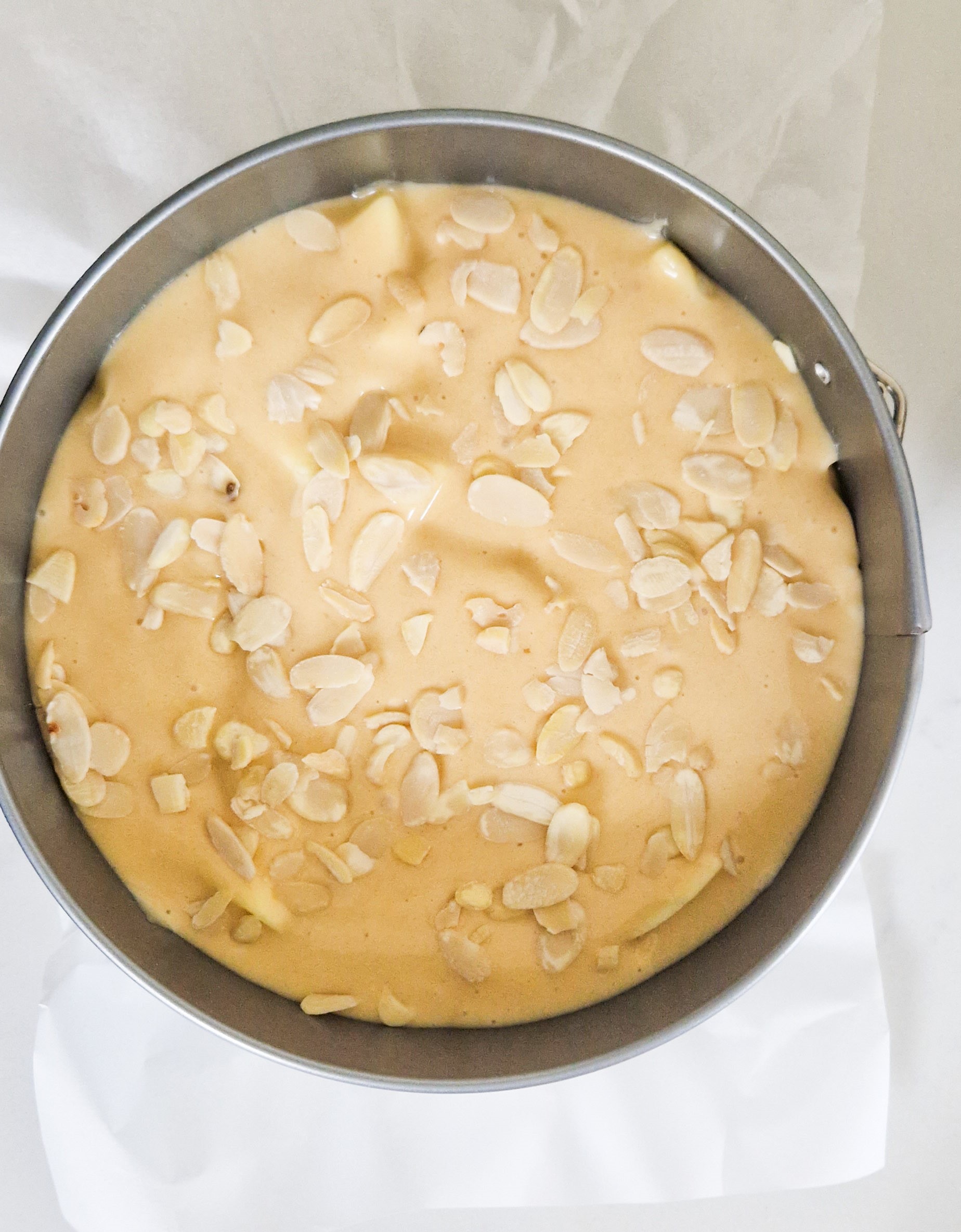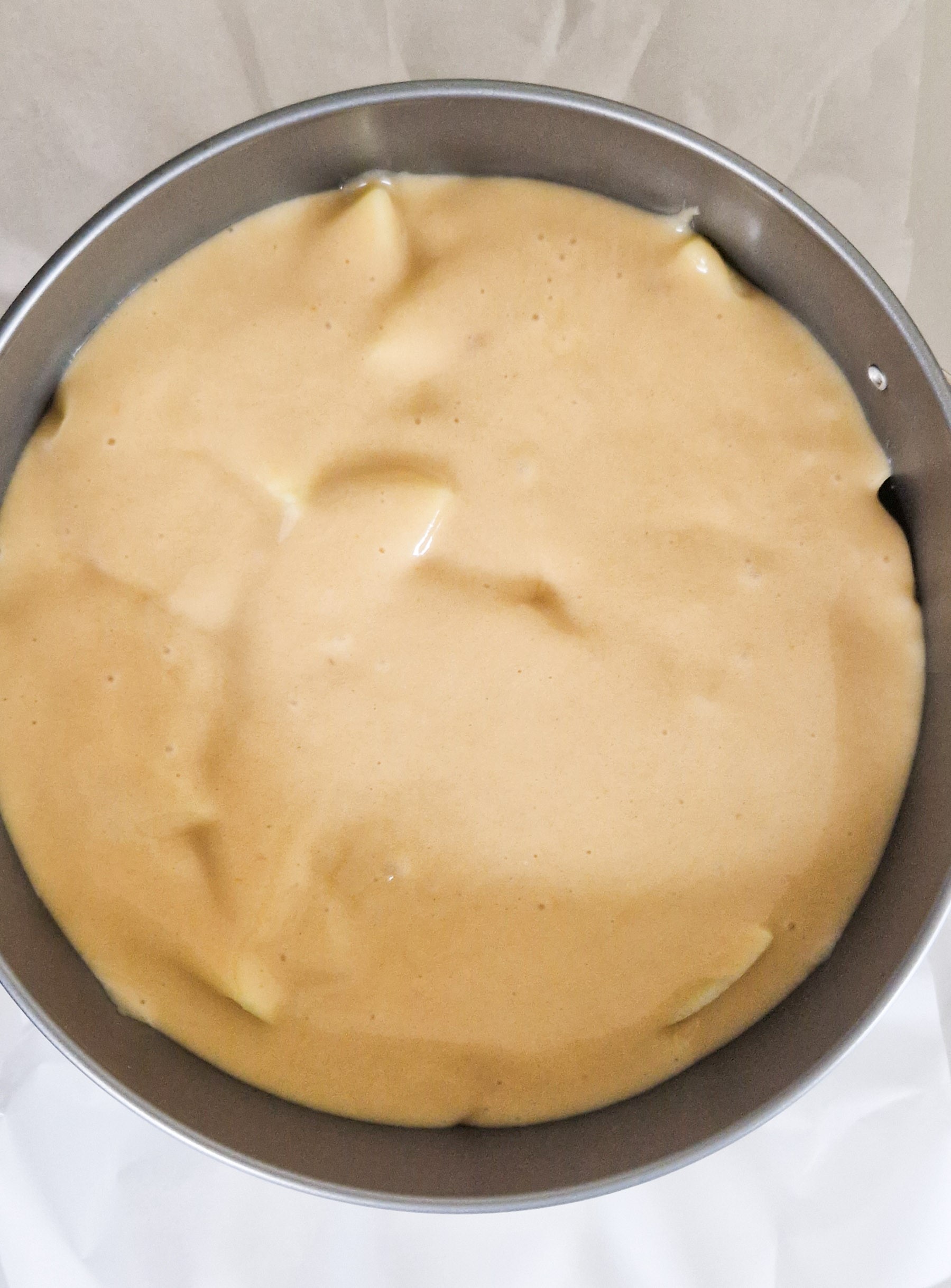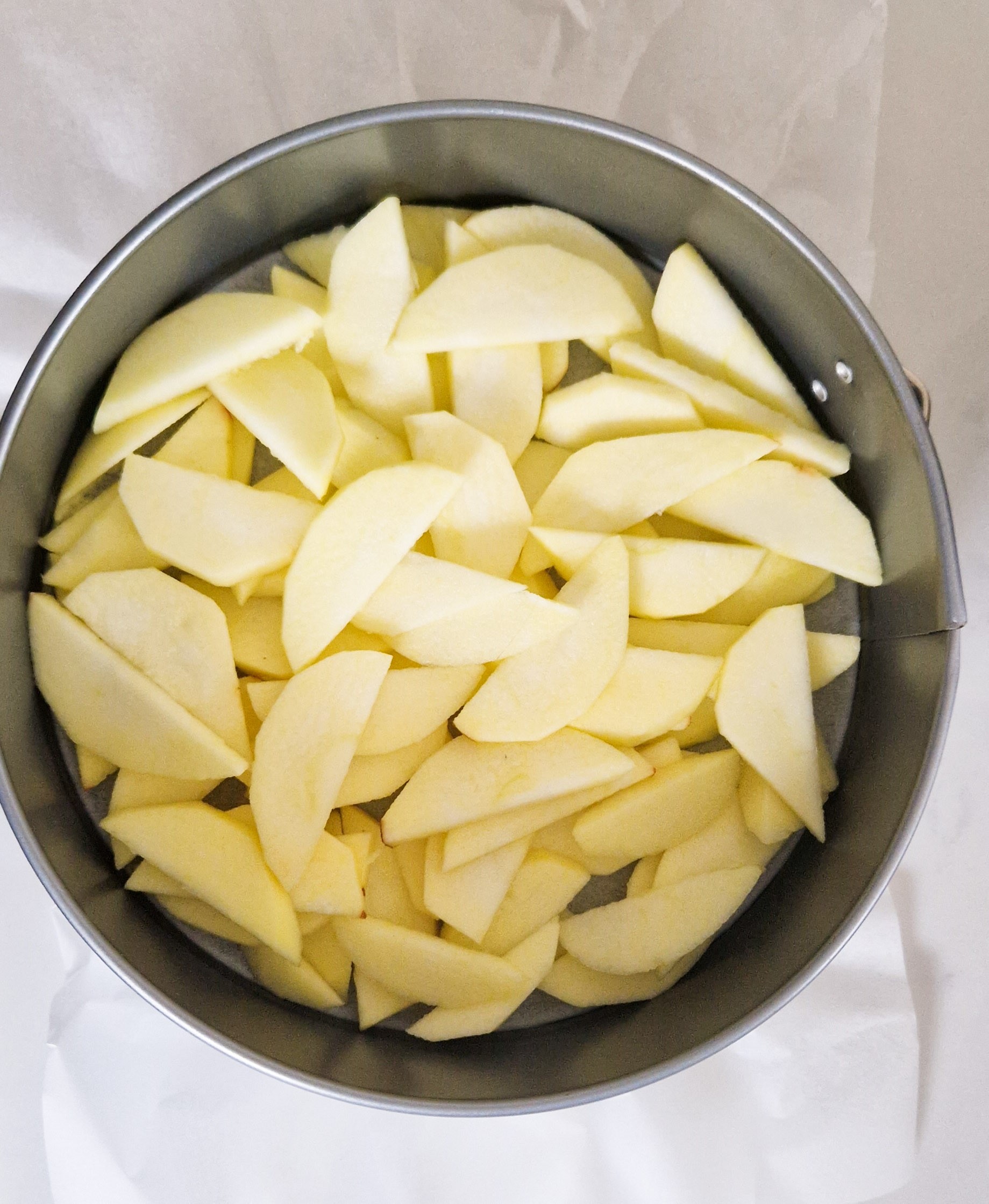 - Asezam merele in tava, nu este nevoie sa fie aranjate intr-o forma sau fel anume, cu cat sunt mai rasfirate cu atat aluatul va patrunde mai bine printre felii si se va distribui mai bine.