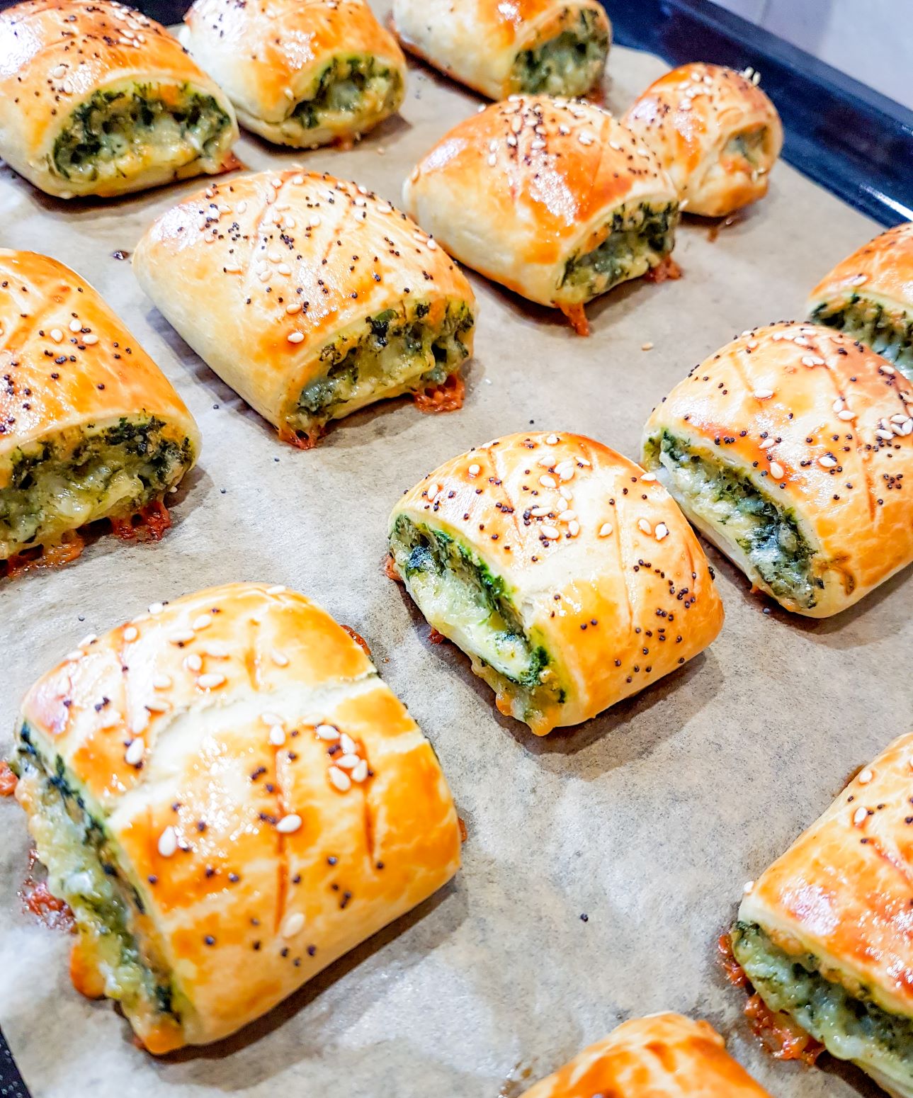 - Cele doua margini laterale sunt apoi aduse catre centru, peste spanac, precum in imaginea de mai jos. Acestea se taie apoi in functie de preferinta,( 4-5 cm lungime) si se aseaza pe tava deja pregatita. Galbenusul de ou se amesteca cu o lingura de lapte ( obtional ) iar apoi cu acesta se ung toate rulourile. Daca vreti crestati putin deasupra cu un cutit fiecare rulou in parte, apoi presarati desupra susan si mac.