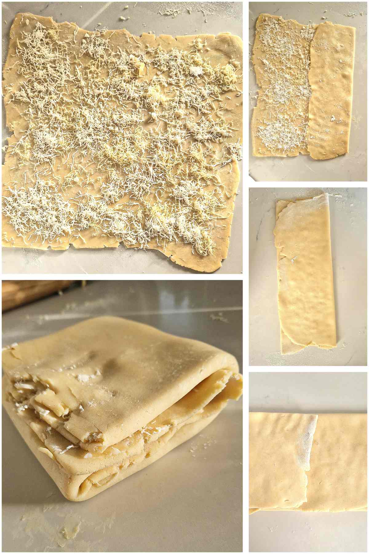 - A doua și a treia împăturire (opțional dar recomandat)Lasă aluatul 10 minute, întinde din nou și repetă procesul:unge cu 40 g unturăpresară 100 g brânzăRepetă de 2–3 ori pentru straturi fragede și aerate.