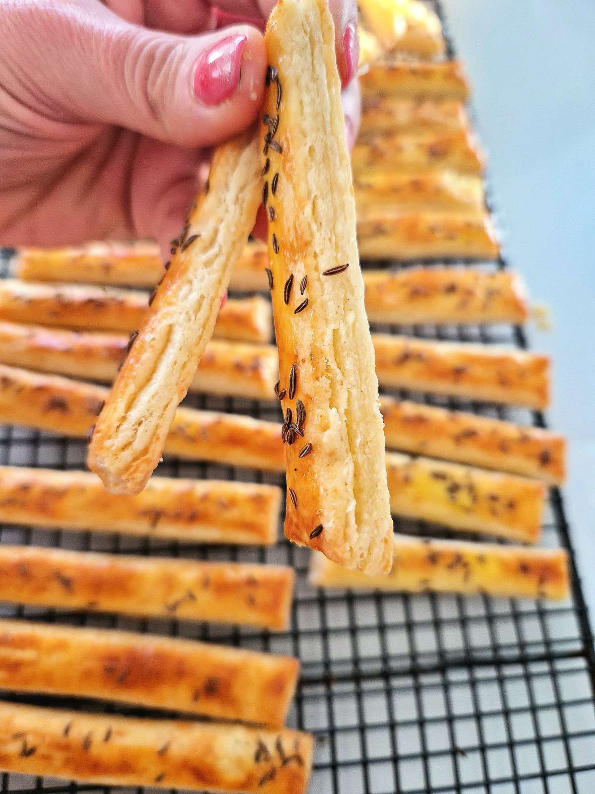 - Formarea sărățelelorLa final, întinde aluatul la 5–7 mm. Taie fâșii uniforme și pune-le în tavă.